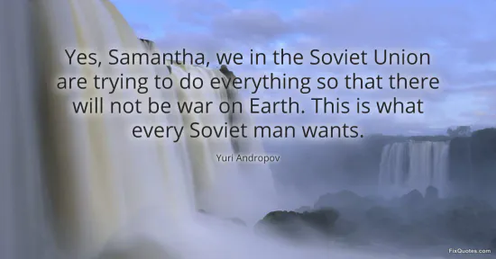 Andropov, Yuri. "Yes, Samantha, we in the Soviet Union are trying to do everything so that there will not be war on Earth. This is what every Soviet man wants." FixQuotes. January 15, 2026. https://fixquotes.com/quotes/yes-samantha-we-in-the-soviet-union-are-trying-to-163069/.