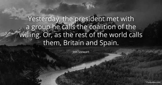 Stewart, Jon. "Yesterday, the president met with a group he calls the coalition of the willing. Or, as the rest of the world calls them, Britain and Spain." FixQuotes. January 18, 2026. https://fixquotes.com/quotes/yesterday-the-president-met-with-a-group-he-calls-12476/.