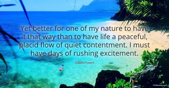 Powell, Dawn. "Yet better for one of my nature to have it that way than to have life a peaceful, placid flow of quiet contentment. I must have days of rushing excitement." FixQuotes. January 17, 2026. https://fixquotes.com/quotes/yet-better-for-one-of-my-nature-to-have-it-that-52862/.