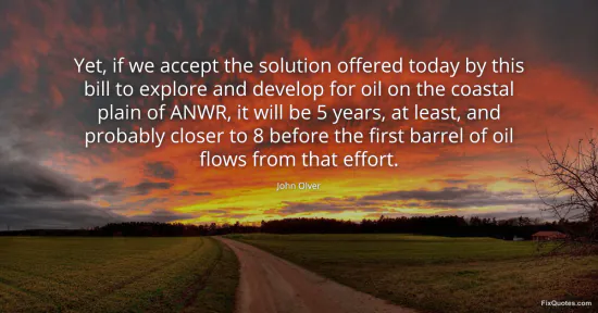 Olver, John. (2026, January 17). Yet, if we accept the solution offered today by this bill to explore and develop for oil on the coastal plain of ANWR, it will be 5 years, at least, and probably closer to 8 before the first barrel of oil flows from that effort. FixQuotes. https://fixquotes.com/quotes/yet-if-we-accept-the-solution-offered-today-by-73300/