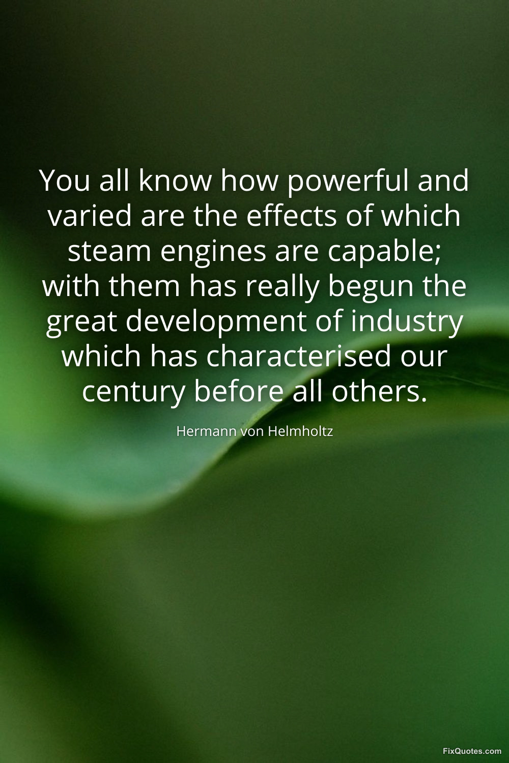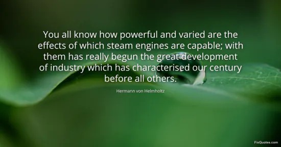 Helmholtz, Hermann von. (2026, January 14). You all know how powerful and varied are the effects of which steam engines are capable; with them has really begun the great development of industry which has characterised our century before all others. FixQuotes. https://fixquotes.com/quotes/you-all-know-how-powerful-and-varied-are-the-77627/