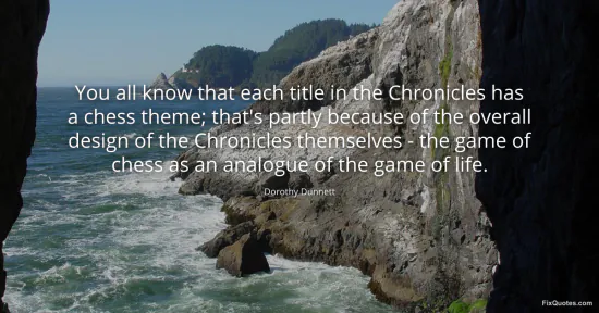 Dunnett, Dorothy. "You all know that each title in the Chronicles has a chess theme; that's partly because of the overall design of the Chronicles themselves - the game of chess as an analogue of the game of life." FixQuotes. January 17, 2026. https://fixquotes.com/quotes/you-all-know-that-each-title-in-the-chronicles-66964/.
