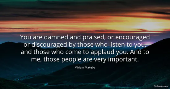 Makeba, Miriam. (2026, January 16). You are damned and praised, or encouraged or discouraged by those who listen to you, and those who come to applaud you. And to me, those people are very important. FixQuotes. https://fixquotes.com/quotes/you-are-damned-and-praised-or-encouraged-or-130103/