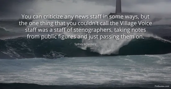 Schanberg, Sydney. "You can criticize any news staff in some ways, but the one thing that you couldn't call the Village Voice staff was a staff of stenographers, taking notes from public figures and just passing them on." FixQuotes. January 16, 2026. https://fixquotes.com/quotes/you-can-criticize-any-news-staff-in-some-ways-but-131066/.