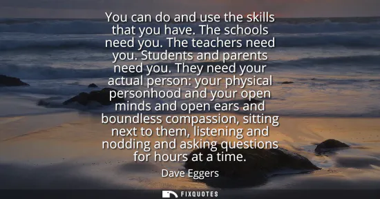 "You can do and use the skills that you have. The schools need you. The teachers need you. Students and parents need you. They need your actual person: your physical personhood and your open minds and open ears and boundless compassion, sitting next to them, listening and nodding and asking questions for hours at a time"