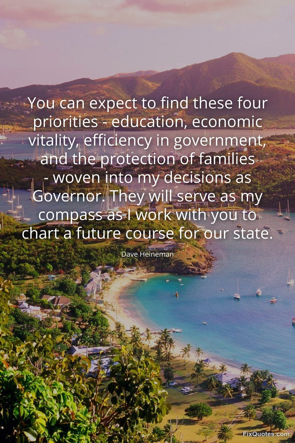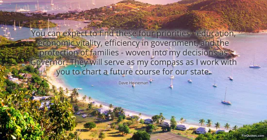 Heineman, Dave. "You can expect to find these four priorities - education, economic vitality, efficiency in government, and the protection of families - woven into my decisions as Governor. They will serve as my compass as I work with you to chart a future course for our state." FixQuotes. February 17, 2026. https://fixquotes.com/quotes/you-can-expect-to-find-these-four-priorities-110941/.