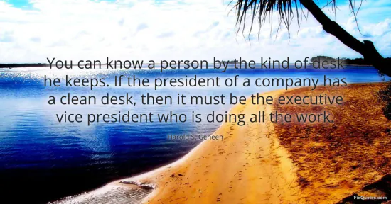 Geneen, Harold S. "You can know a person by the kind of desk he keeps. If the president of a company has a clean desk, then it must be the executive vice president who is doing all the work." FixQuotes. February 20, 2026. https://fixquotes.com/quotes/you-can-know-a-person-by-the-kind-of-desk-he-12988/.