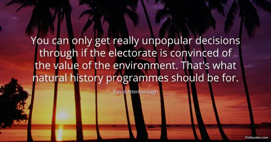Attenborough, David. "You can only get really unpopular decisions through if the electorate is convinced of the value of the environment. That's what natural history programmes should be for." FixQuotes. January 17, 2026. https://fixquotes.com/quotes/you-can-only-get-really-unpopular-decisions-42120/.
