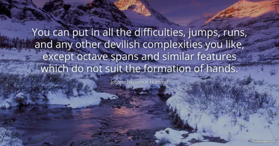 Hummel, Johann Nepomuk. "You can put in all the difficulties, jumps, runs, and any other devilish complexities you like, except octave spans and similar features which do not suit the formation of hands." FixQuotes. January 16, 2026. https://fixquotes.com/quotes/you-can-put-in-all-the-difficulties-jumps-runs-99466/.