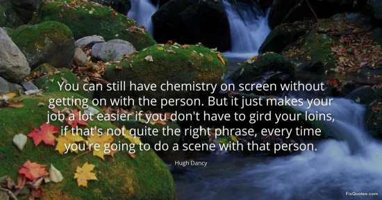Dancy, Hugh. "You can still have chemistry on screen without getting on with the person. But it just makes your job a lot easier if you don't have to gird your loins, if that's not quite the right phrase, every time you're going to do a scene with that person." FixQuotes. January 16, 2026. https://fixquotes.com/quotes/you-can-still-have-chemistry-on-screen-without-85488/.