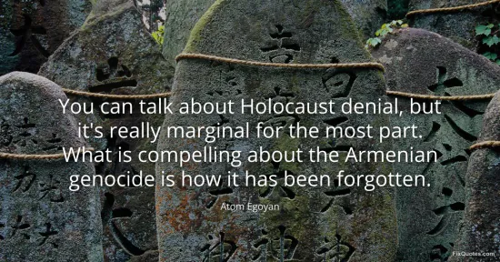 Egoyan, Atom. "You can talk about Holocaust denial, but it's really marginal for the most part. What is compelling about the Armenian genocide is how it has been forgotten." FixQuotes. February 16, 2026. https://fixquotes.com/quotes/you-can-talk-about-holocaust-denial-but-its-41973/.