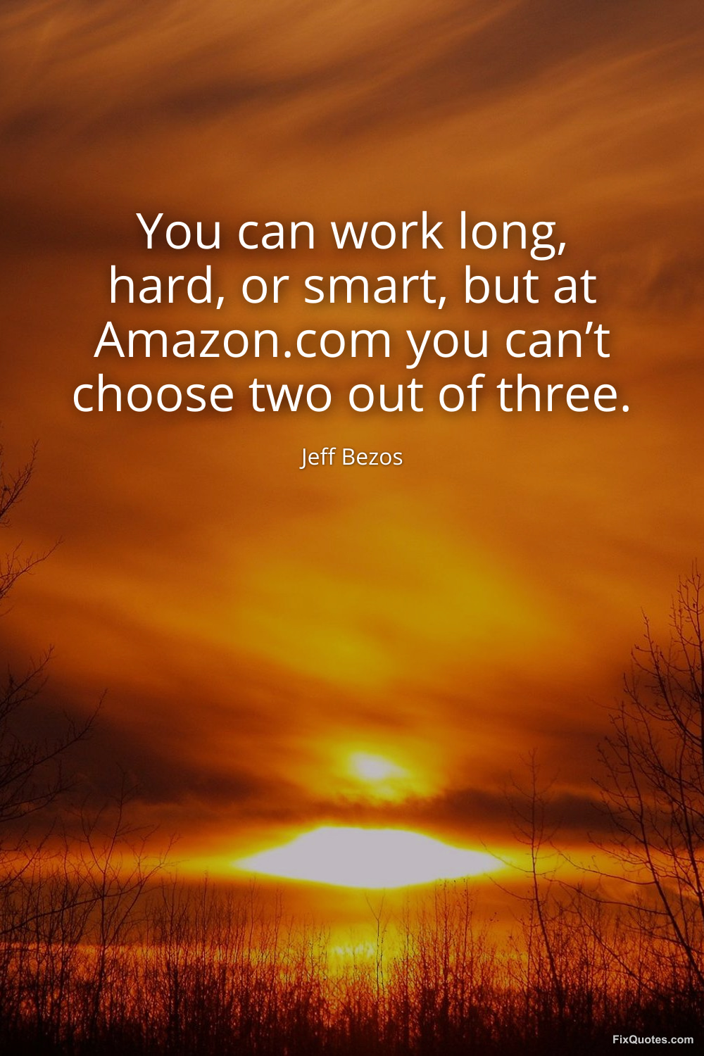 Bezos, Jeff. "You can work long, hard, or smart, but at Amazon.com you can’t choose two out of three." FixQuotes. March 25, 2026. https://fixquotes.com/quotes/you-can-work-long-hard-or-smart-but-at-amazoncom-186397/.