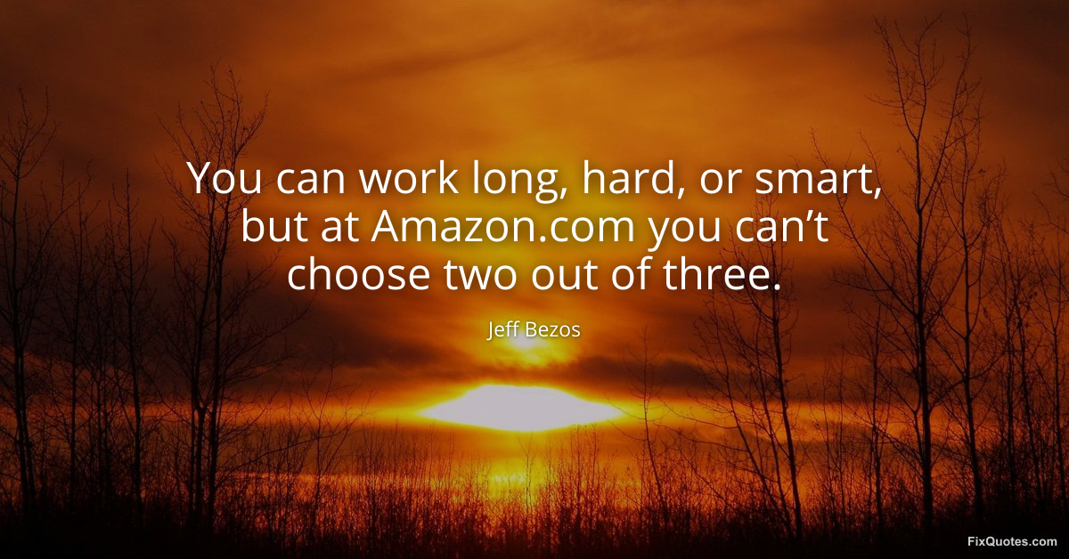 "You can work long, hard, or smart, but at Amazon.com you can’t choose two out of three." FixQuotes, 25 Mar. 2026, https://fixquotes.com/quotes/you-can-work-long-hard-or-smart-but-at-amazoncom-186397/. Accessed 30 Mar. 2026.