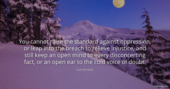 Hand, Learned. "You cannot raise the standard against oppression, or leap into the breach to relieve injustice, and still keep an open mind to every disconcerting fact, or an open ear to the cold voice of doubt." FixQuotes. January 17, 2026. https://fixquotes.com/quotes/you-cannot-raise-the-standard-against-oppression-54428/.
