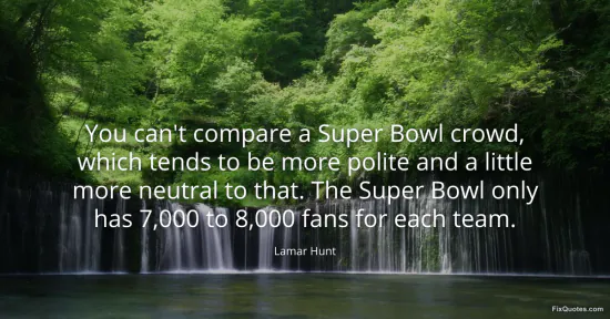 Hunt, Lamar. "You can't compare a Super Bowl crowd, which tends to be more polite and a little more neutral to that. The Super Bowl only has 7,000 to 8,000 fans for each team." FixQuotes. January 15, 2026. https://fixquotes.com/quotes/you-cant-compare-a-super-bowl-crowd-which-tends-158855/.