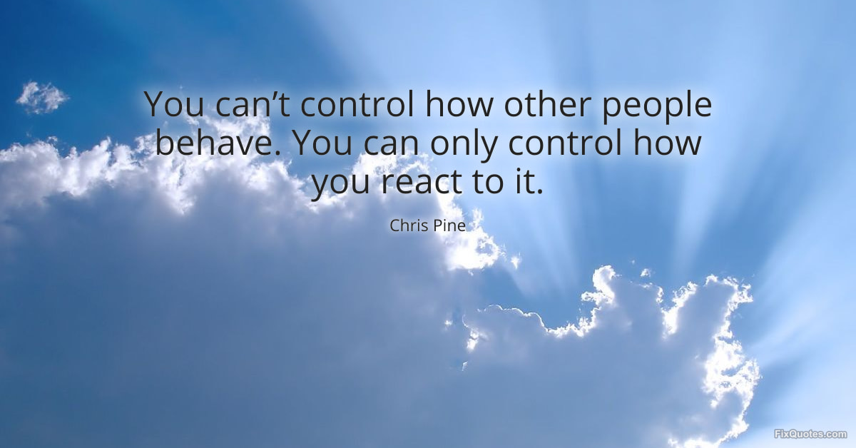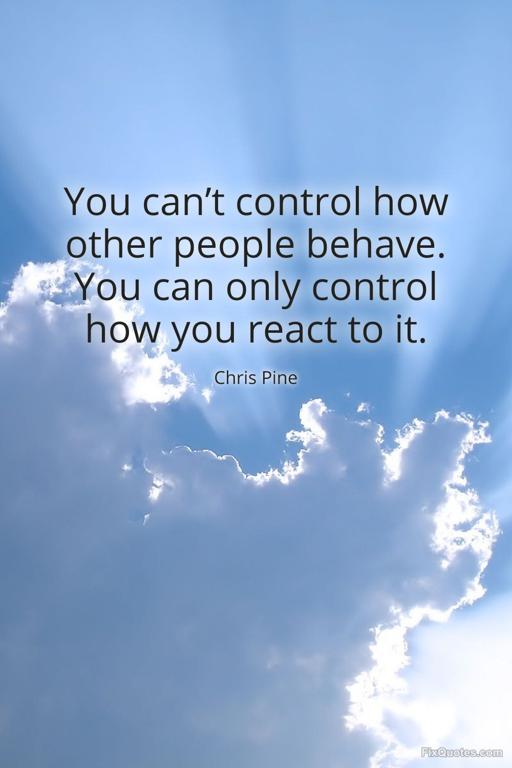 Pine, Chris. "You can’t control how other people behave. You can only control how you react to it." FixQuotes. January 25, 2026. https://fixquotes.com/quotes/you-cant-control-how-other-people-behave-you-can-184191/.