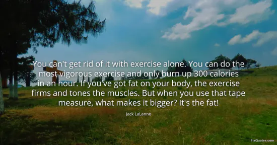LaLanne, Jack. (2026, January 16). You can't get rid of it with exercise alone. You can do the most vigorous exercise and only burn up 300 calories in an hour. If you've got fat on your body, the exercise firms and tones the muscles. But when you use that tape measure, what makes it bigger? It's the fat! FixQuotes. https://fixquotes.com/quotes/you-cant-get-rid-of-it-with-exercise-alone-you-106401/