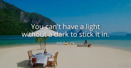 Arlo Guthrie’s line is a folksinger’s way of smuggling a hard truth into a joke: optimism isn’t a mood, it’s a contrast. “You can’t have a light without a dark to stick it in” sounds like back-porch wisdom, but it’s doing more than offering comfort. The phrasing makes “dark” practical, almost useful - not a villain to be defeated, but the necessary backdrop that makes illumination legible. The verb “stick” is key: casual, a little crude, deliberately unpoetic. It yanks the idea out of greeting-card uplift and plants it in the everyday world where people improvise meaning with whatever’s on hand.