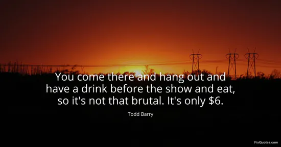 Barry, Todd. "You come there and hang out and have a drink before the show and eat, so it's not that brutal. It's only $6." FixQuotes. January 16, 2026. https://fixquotes.com/quotes/you-come-there-and-hang-out-and-have-a-drink-107148/.