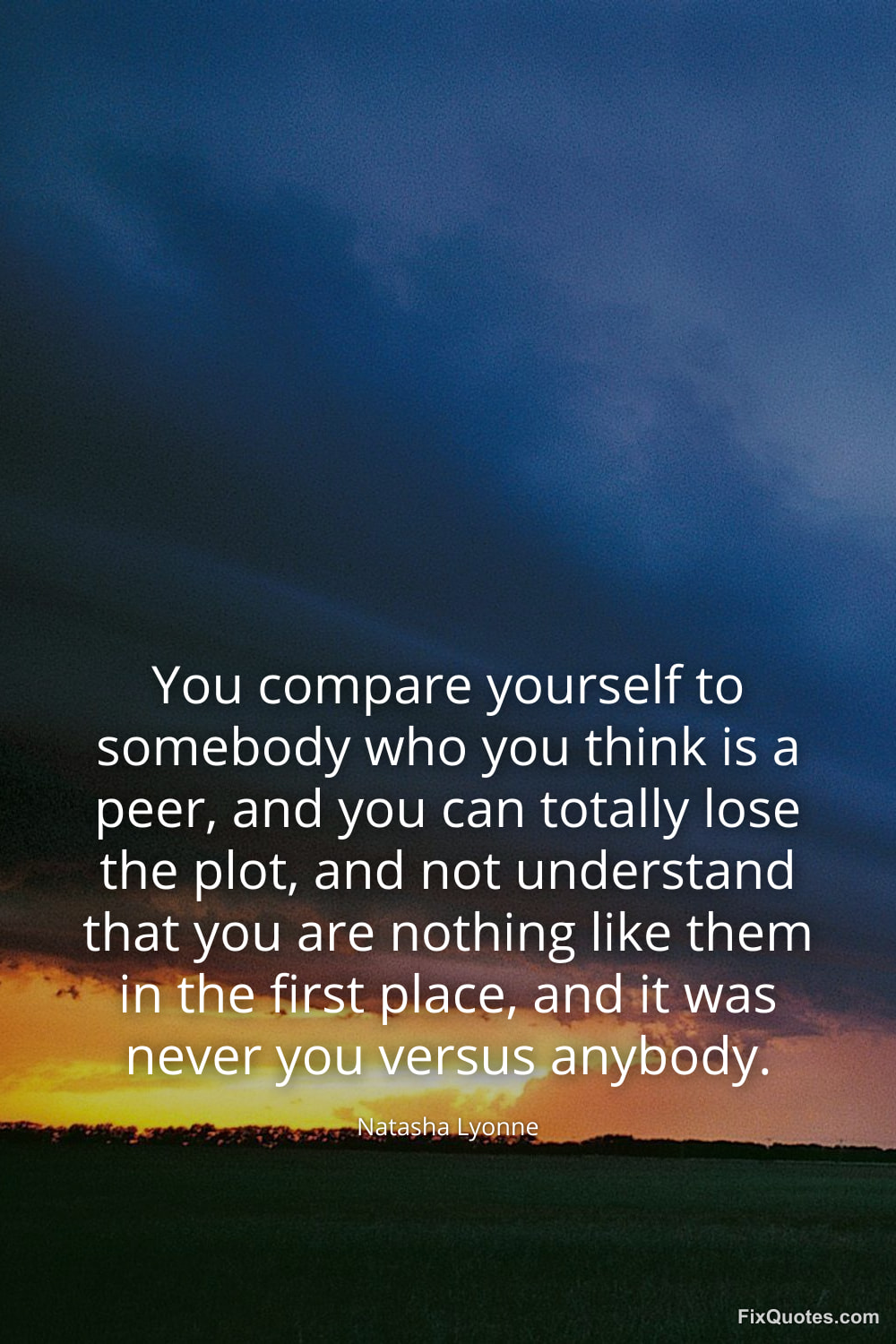 Lyonne, Natasha. (2026, January 25). You compare yourself to somebody who you think is a peer, and you can totally lose the plot, and not understand that you are nothing like them in the first place, and it was never you versus anybody. FixQuotes. https://fixquotes.com/quotes/you-compare-yourself-to-somebody-who-you-think-is-184344/