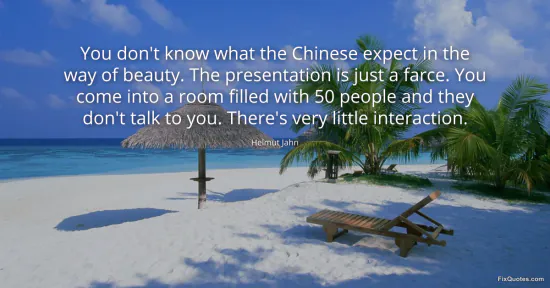 Jahn, Helmut. (2026, January 17). You don't know what the Chinese expect in the way of beauty. The presentation is just a farce. You come into a room filled with 50 people and they don't talk to you. There's very little interaction. FixQuotes. https://fixquotes.com/quotes/you-dont-know-what-the-chinese-expect-in-the-way-53938/