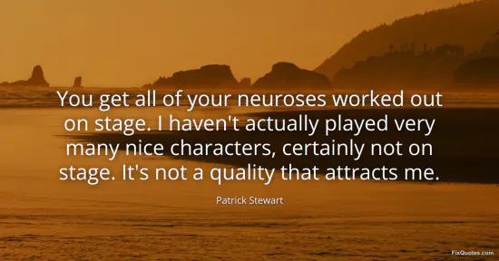 Stewart, Patrick. "You get all of your neuroses worked out on stage. I haven't actually played very many nice characters, certainly not on stage. It's not a quality that attracts me." FixQuotes. January 17, 2026. https://fixquotes.com/quotes/you-get-all-of-your-neuroses-worked-out-on-stage-76840/.