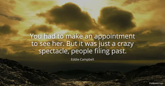 Campbell, Eddie. (2026, January 15). You had to make an appointment to see her. But it was just a crazy spectacle, people filing past. FixQuotes. https://fixquotes.com/quotes/you-had-to-make-an-appointment-to-see-her-but-it-143591/