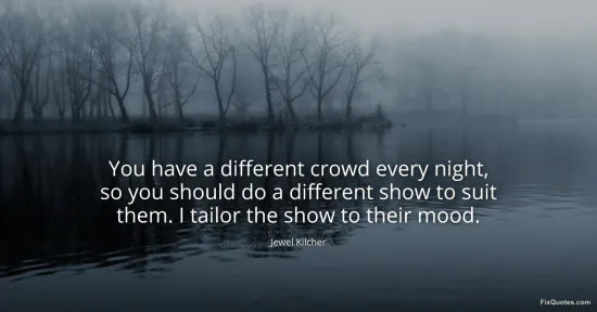 Kilcher, Jewel. "You have a different crowd every night, so you should do a different show to suit them. I tailor the show to their mood." FixQuotes. January 17, 2026. https://fixquotes.com/quotes/you-have-a-different-crowd-every-night-so-you-62520/.