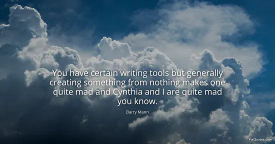 Mann, Barry. (2026, January 16). You have certain writing tools but generally creating something from nothing makes one quite mad and Cynthia and I are quite mad you know. FixQuotes. https://fixquotes.com/quotes/you-have-certain-writing-tools-but-generally-138754/