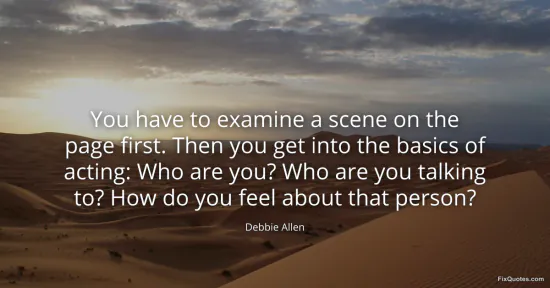Allen, Debbie. (2026, January 15). You have to examine a scene on the page first. Then you get into the basics of acting: Who are you? Who are you talking to? How do you feel about that person? FixQuotes. https://fixquotes.com/quotes/you-have-to-examine-a-scene-on-the-page-first-144603/