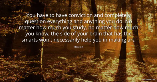 Lin, Maya. (2026, January 17). You have to have conviction and completely question everything and anything you do. No matter how much you study, no matter how much you know, the side of your brain that has the smarts won't necessarily help you in making art. FixQuotes. https://fixquotes.com/quotes/you-have-to-have-conviction-and-completely-36261/