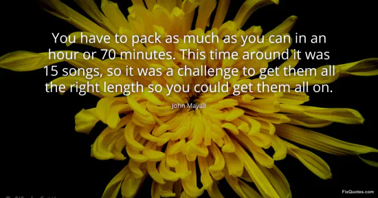 Mayall, John. "You have to pack as much as you can in an hour or 70 minutes. This time around it was 15 songs, so it was a challenge to get them all the right length so you could get them all on." FixQuotes. January 16, 2026. https://fixquotes.com/quotes/you-have-to-pack-as-much-as-you-can-in-an-hour-or-86102/.
