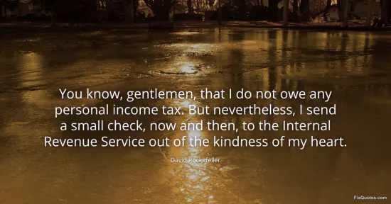 Rockefeller, David. "You know, gentlemen, that I do not owe any personal income tax. But nevertheless, I send a small check, now and then, to the Internal Revenue Service out of the kindness of my heart." FixQuotes. January 17, 2026. https://fixquotes.com/quotes/you-know-gentlemen-that-i-do-not-owe-any-personal-74161/.