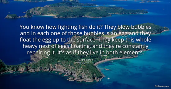 Lorde, Audre. (2026, January 16). You know how fighting fish do it? They blow bubbles and in each one of those bubbles is an egg and they float the egg up to the surface. They keep this whole heavy nest of eggs floating, and they're constantly repairing it. It's as if they live in both elements. FixQuotes. https://fixquotes.com/quotes/you-know-how-fighting-fish-do-it-they-blow-137864/