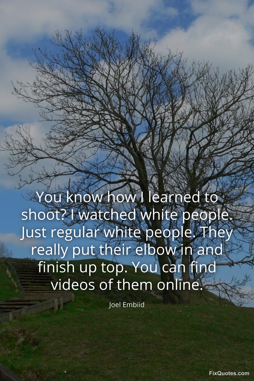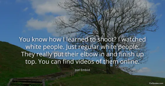 Embiid, Joel. (2026, January 30). You know how I learned to shoot? I watched white people. Just regular white people. They really put their elbow in and finish up top. You can find videos of them online. FixQuotes. https://fixquotes.com/quotes/you-know-how-i-learned-to-shoot-i-watched-white-184823/