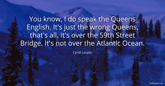 Lauper, Cyndi. (2026, February 16). You know, I do speak the Queens English. It's just the wrong Queens, that's all. It's over the 59th Street Bridge. It's not over the Atlantic Ocean. FixQuotes. https://fixquotes.com/quotes/you-know-i-do-speak-the-queens-english-its-just-136011/