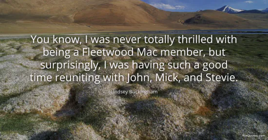 Buckingham, Lindsey. (2026, January 16). You know, I was never totally thrilled with being a Fleetwood Mac member, but surprisingly, I was having such a good time reuniting with John, Mick, and Stevie. FixQuotes. https://fixquotes.com/quotes/you-know-i-was-never-totally-thrilled-with-being-103813/
