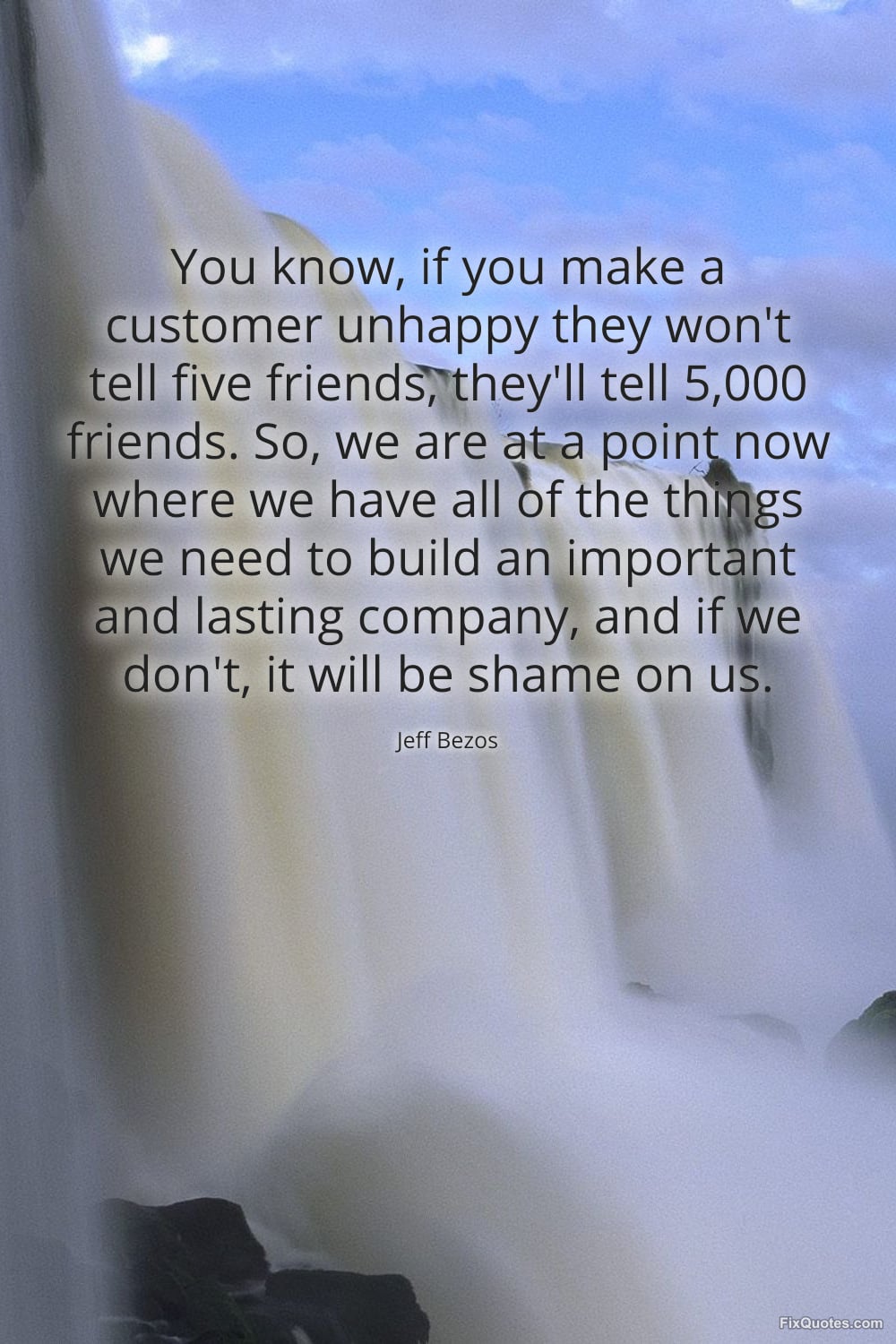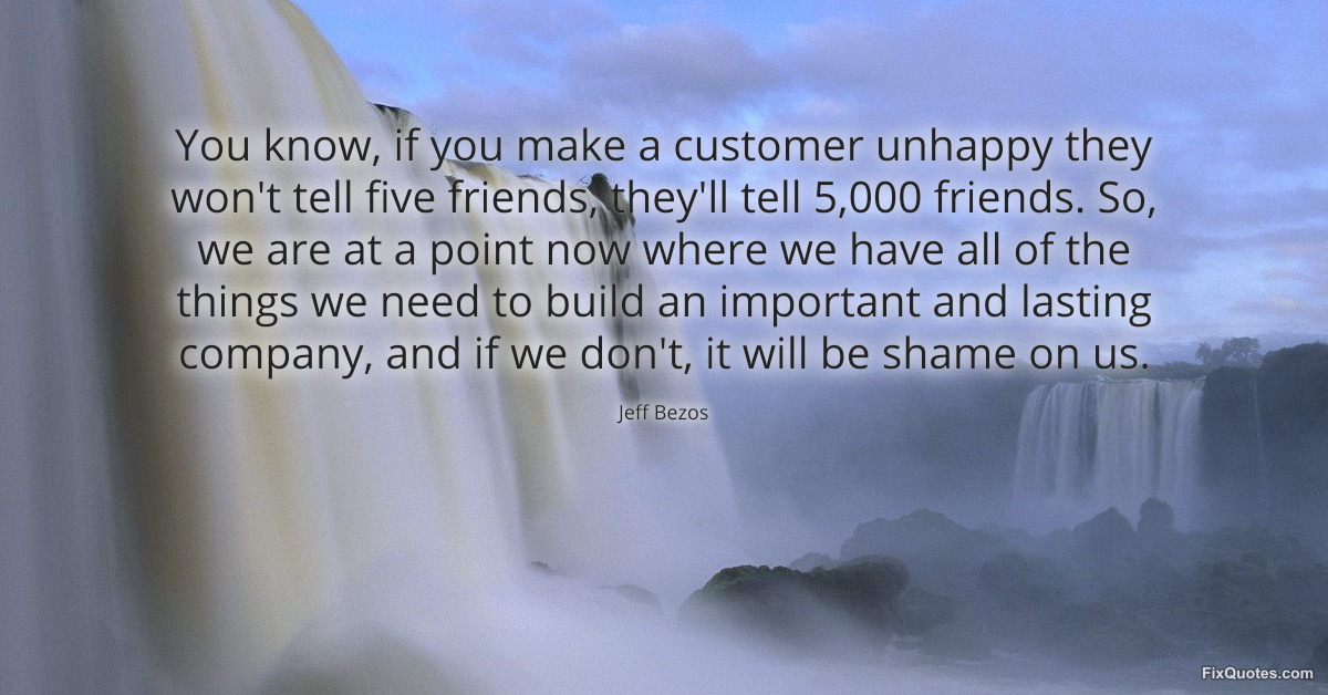 Bezos, Jeff. "You know, if you make a customer unhappy they won't tell five friends, they'll tell 5,000 friends. So, we are at a point now where we have all of the things we need to build an important and lasting company, and if we don't, it will be shame on us." FixQuotes. March 25, 2026. https://fixquotes.com/quotes/you-know-if-you-make-a-customer-unhappy-they-wont-186406/.