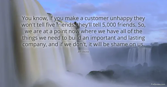 Bezos, Jeff. (2026, March 25). You know, if you make a customer unhappy they won't tell five friends, they'll tell 5,000 friends. So, we are at a point now where we have all of the things we need to build an important and lasting company, and if we don't, it will be shame on us. FixQuotes. https://fixquotes.com/quotes/you-know-if-you-make-a-customer-unhappy-they-wont-186406/