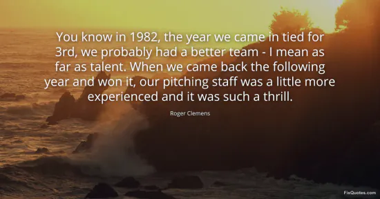 Clemens, Roger. "You know in 1982, the year we came in tied for 3rd, we probably had a better team - I mean as far as talent. When we came back the following year and won it, our pitching staff was a little more experienced and it was such a thrill." FixQuotes. January 16, 2026. https://fixquotes.com/quotes/you-know-in-1982-the-year-we-came-in-tied-for-3rd-134614/.
