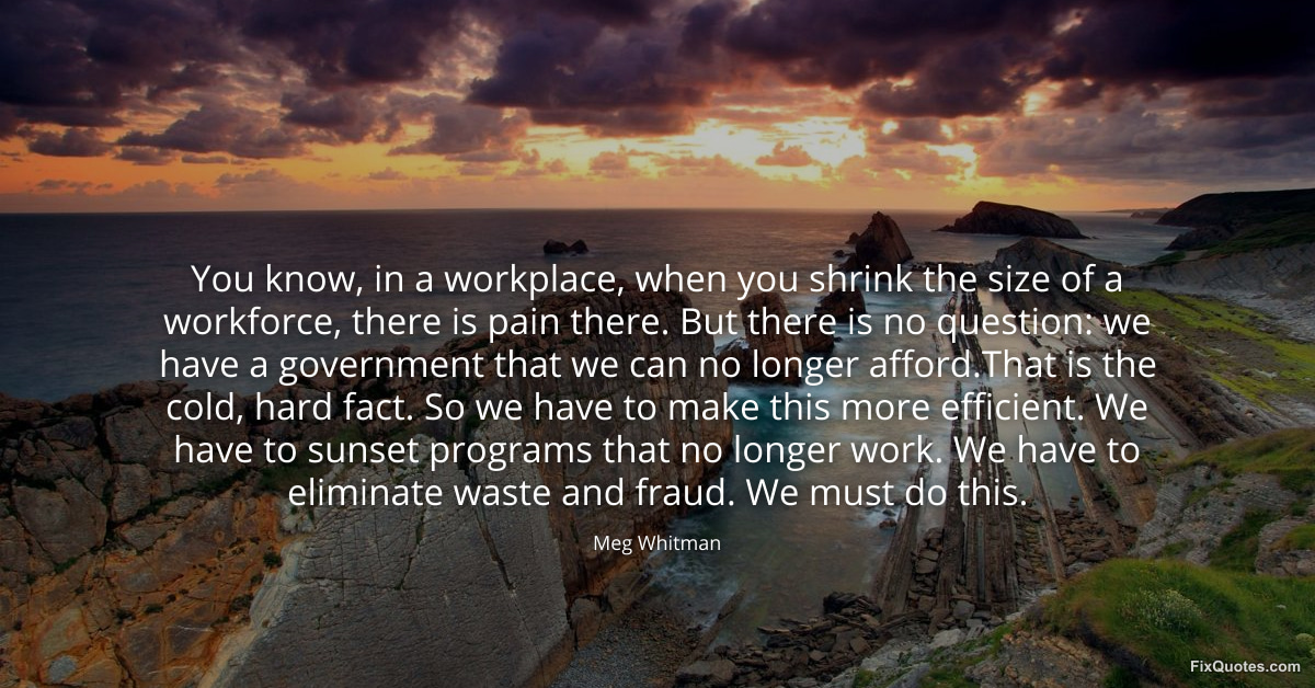 Whitman, Meg. (2026, January 16). You know, in a workplace, when you shrink the size of a workforce, there is pain there. But there is no question: we have a government that we can no longer afford.That is the cold, hard fact. So we have to make this more efficient. We have to sunset programs that no longer work. We have to eliminate waste and fraud. We must do this. FixQuotes. https://fixquotes.com/quotes/you-know-in-a-workplace-when-you-shrink-the-size-130021/
