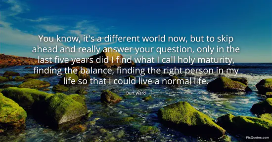 Ward, Burt. (2026, January 17). You know, it's a different world now, but to skip ahead and really answer your question, only in the last five years did I find what I call holy maturity, finding the balance, finding the right person in my life so that I could live a normal life. FixQuotes. https://fixquotes.com/quotes/you-know-its-a-different-world-now-but-to-skip-37835/
