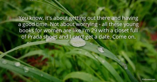 Tyler, Aisha. "You know, it's about getting out there and having a good time. Not about worrying - all these young books for women are like I'm 29 with a closet full of Prada shoes and I can't get a date. Come on." FixQuotes. January 17, 2026. https://fixquotes.com/quotes/you-know-its-about-getting-out-there-and-having-a-36674/.
