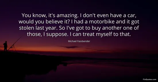 Fassbender, Michael. (2026, January 17). You know, it's amazing. I don't even have a car, would you believe it? I had a motorbike and it got stolen last year. So I've got to buy another one of those, I suppose. I can treat myself to that. FixQuotes. https://fixquotes.com/quotes/you-know-its-amazing-i-dont-even-have-a-car-would-71288/