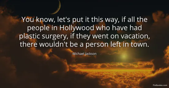 Jackson, Michael. (2026, January 18). You know, let's put it this way, if all the people in Hollywood who have had plastic surgery, if they went on vacation, there wouldn't be a person left in town. FixQuotes. https://fixquotes.com/quotes/you-know-lets-put-it-this-way-if-all-the-people-17135/