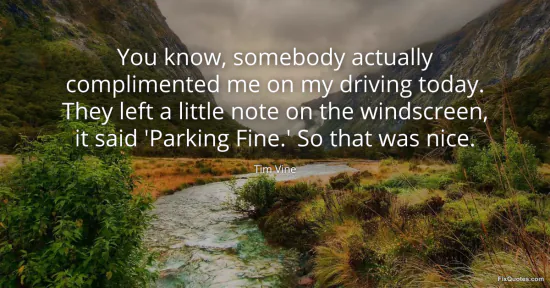 Vine, Tim. "You know, somebody actually complimented me on my driving today. They left a little note on the windscreen, it said 'Parking Fine.' So that was nice." FixQuotes. January 15, 2026. https://fixquotes.com/quotes/you-know-somebody-actually-complimented-me-on-my-159787/.