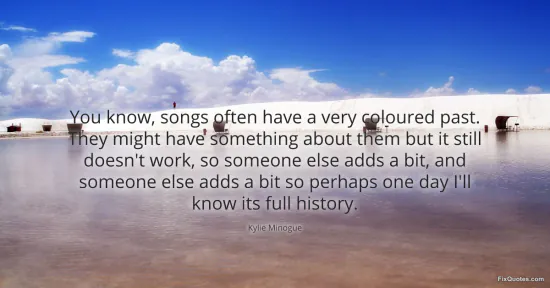 Minogue, Kylie. (2026, January 16). You know, songs often have a very coloured past. They might have something about them but it still doesn't work, so someone else adds a bit, and someone else adds a bit so perhaps one day I'll know its full history. FixQuotes. https://fixquotes.com/quotes/you-know-songs-often-have-a-very-coloured-past-122817/