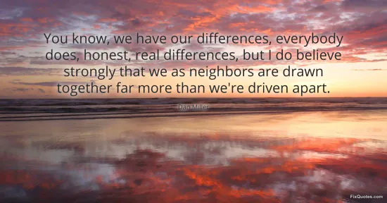 Miller, Dan. "You know, we have our differences, everybody does, honest, real differences, but I do believe strongly that we as neighbors are drawn together far more than we're driven apart." FixQuotes. January 15, 2026. https://fixquotes.com/quotes/you-know-we-have-our-differences-everybody-does-161214/.