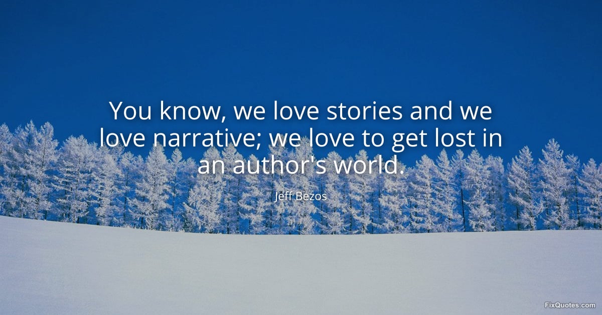 Bezos, Jeff. "You know, we love stories and we love narrative; we love to get lost in an author's world." FixQuotes. March 25, 2026. https://fixquotes.com/quotes/you-know-we-love-stories-and-we-love-narrative-we-186470/.