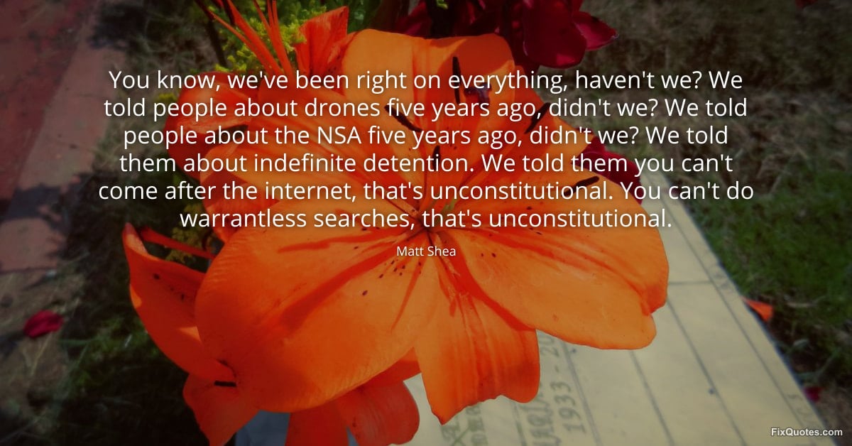 Shea, Matt. (2026, February 9). You know, we've been right on everything, haven't we? We told people about drones five years ago, didn't we? We told people about the NSA five years ago, didn't we? We told them about indefinite detention. We told them you can't come after the internet, that's unconstitutional. You can't do warrantless searches, that's unconstitutional. FixQuotes. https://fixquotes.com/quotes/you-know-weve-been-right-on-everything-havent-we-185004/